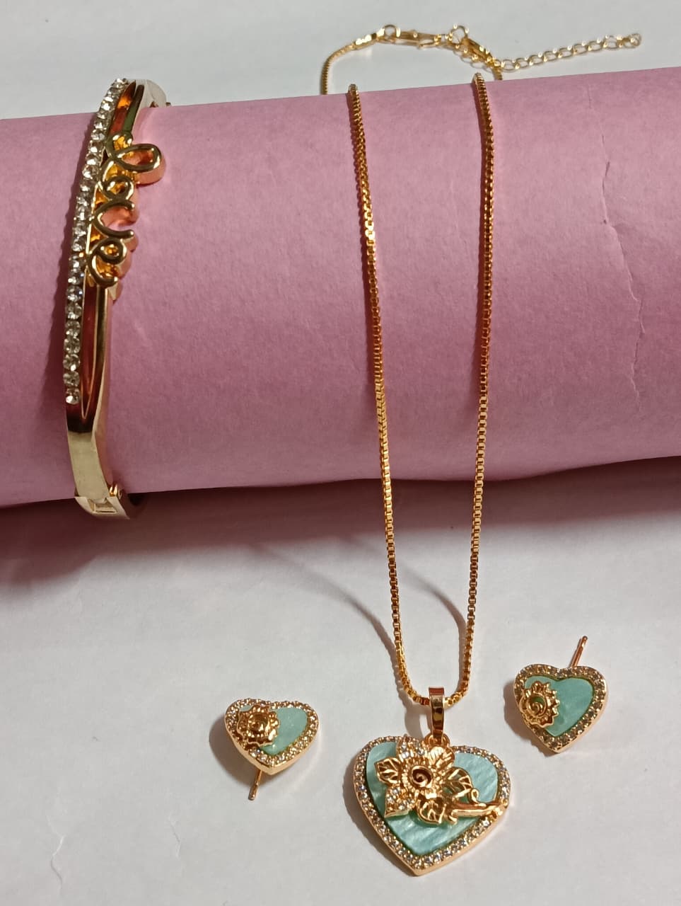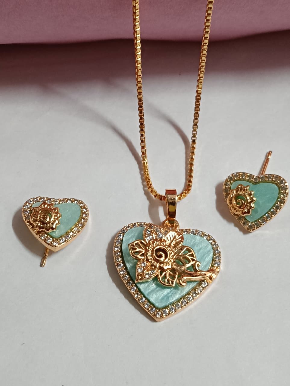 Grace your look with the Emerald Heart Blossom Jewelry Set, featuring a delicate heart-shaped pendant, matching earrings, and a sparkling bracelet. The soft green enamel hearts adorned with golden floral details exude romance and sophistication — perfect for gifting or adding charm to your everyday style.