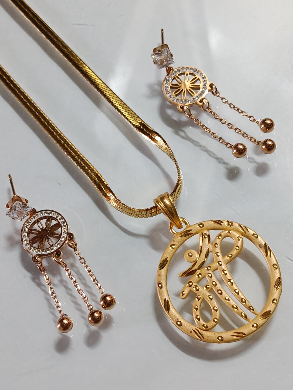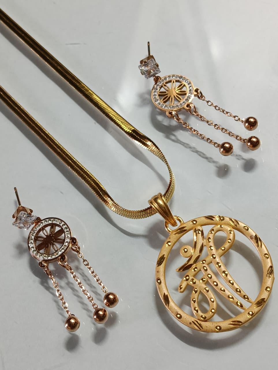 Add a divine touch to your style with this Elegant Om Designer Pendant Set. Crafted with a beautiful golden finish, this set includes a stylish chain and matching earrings that perfectly blend tradition and elegance — ideal for festive occasions, daily wear, or gifting.