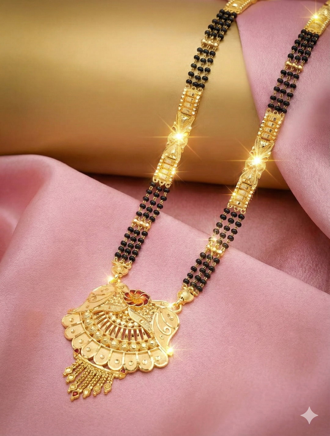 An elegant, gold-plated mangalsutra featuring a double-string of black beads, intricate rectangular gold accents, and a bold, ornate pendant with floral detailing and delicate fringe work. Perfect for weddings and traditional occasions.