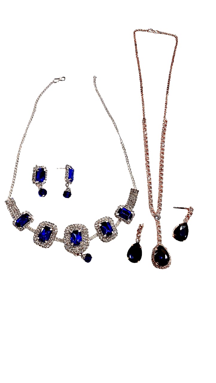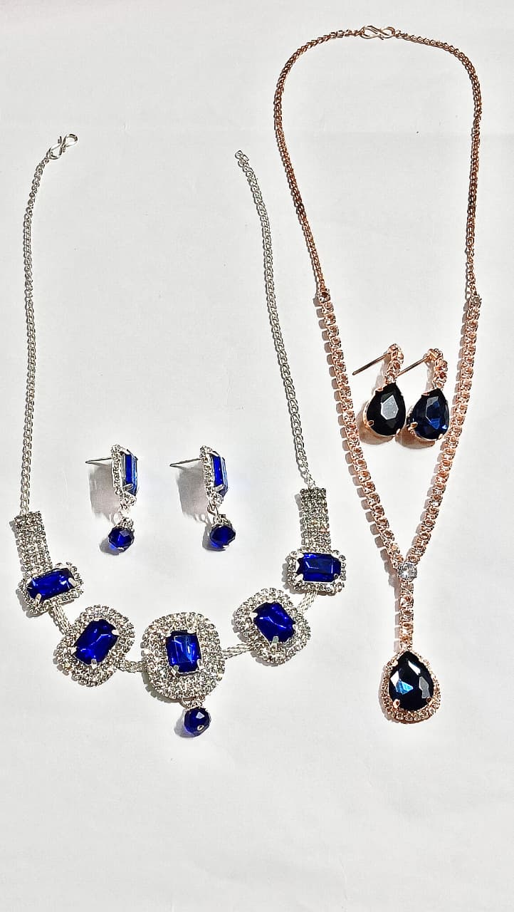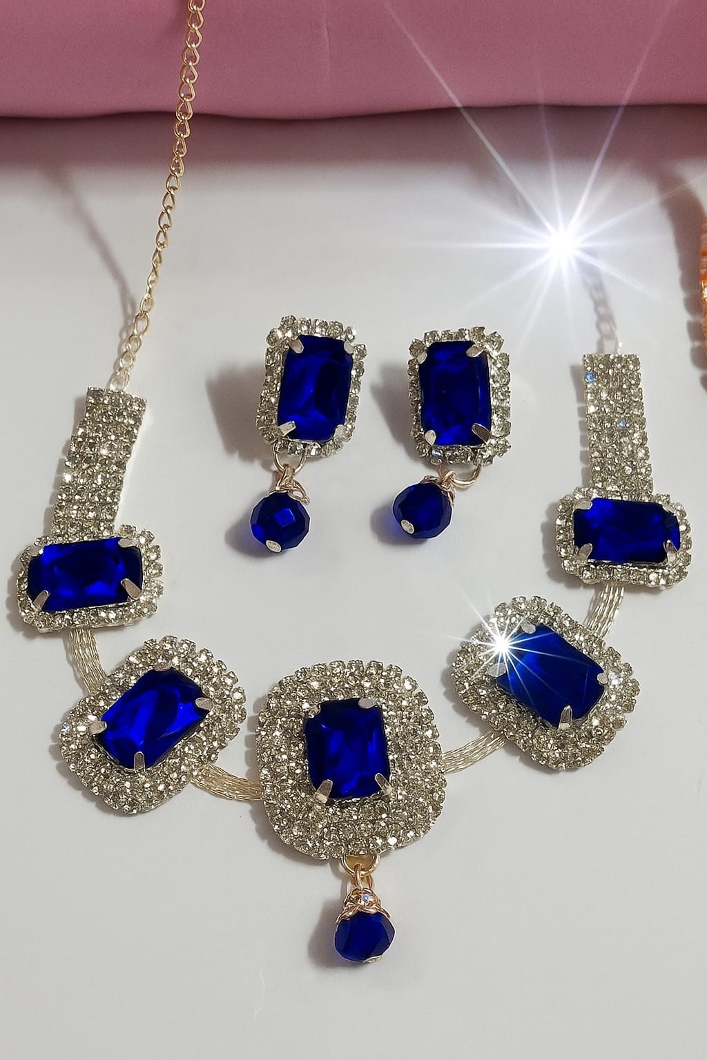 Add a touch of royal charm with this stunning jewelry set featuring deep blue sapphire-inspired stones. The set includes a dazzling necklace and matching earrings, perfect for weddings, parties, or special occasions. Crafted with shimmering crystals and elegant detailing for a timeless, luxurious look.